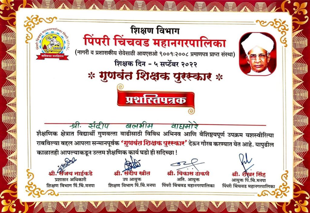 श्री.संदिप बलभीम वाघमोरे यांना २०२१-२२ आदर्श शिक्षक पुरस्कार मा.श्रीरंग बारणे(खासदार पिंपरी चिंचवड ), मा.शेखर सिंह (आयुक्त पिं. चि. म.न.पा) श्री. विकास ढाकणे ( अति.आयुक्त पिं. चि. म.न.पा) श्री संदीप खोत उप आयुक्त शिक्षण विभाग पिं. चि. म.न.पा) श्री संजय नाईकडे (प्रशासनाधिकारी शिक्षण विभाग पिं. चि. म.न.पा) यांच्या हस्ते प्रदान 5-9-2022